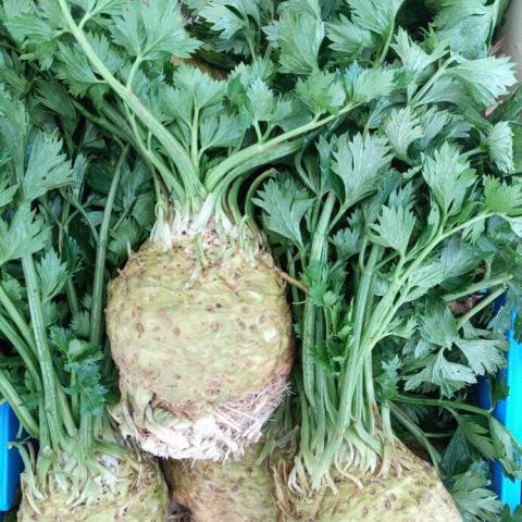 Petits céléris raves fraîchement récoltés vendus avec les feuilles, pesant environ 400 g.